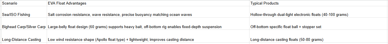 EVA 낚시는 물질 성능 혁신 (비 흡수성, 높은 탄력성)과 기능 설계 확장 (바닥 오프 톰 리그, 전자 통합)을 통해 떠 다니며 담수 Bighead 잉어 낚시에서 심해 ISO 낚시에 이르기까지 모든 시나리오를 다룹니다. 그들은 특히 고강도와 복잡한 환경에서 상당한 이점을 보여줍니다.